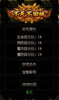 一、玩家累计充值(活动3天累计)达到20000RMB,可以自己选四至六个字-带特效定制称号,全属性增加1%。(定制称号在活动结束后统一提交制作,延后发放;活动期间,每个玩家仅能定制一个1%称号)